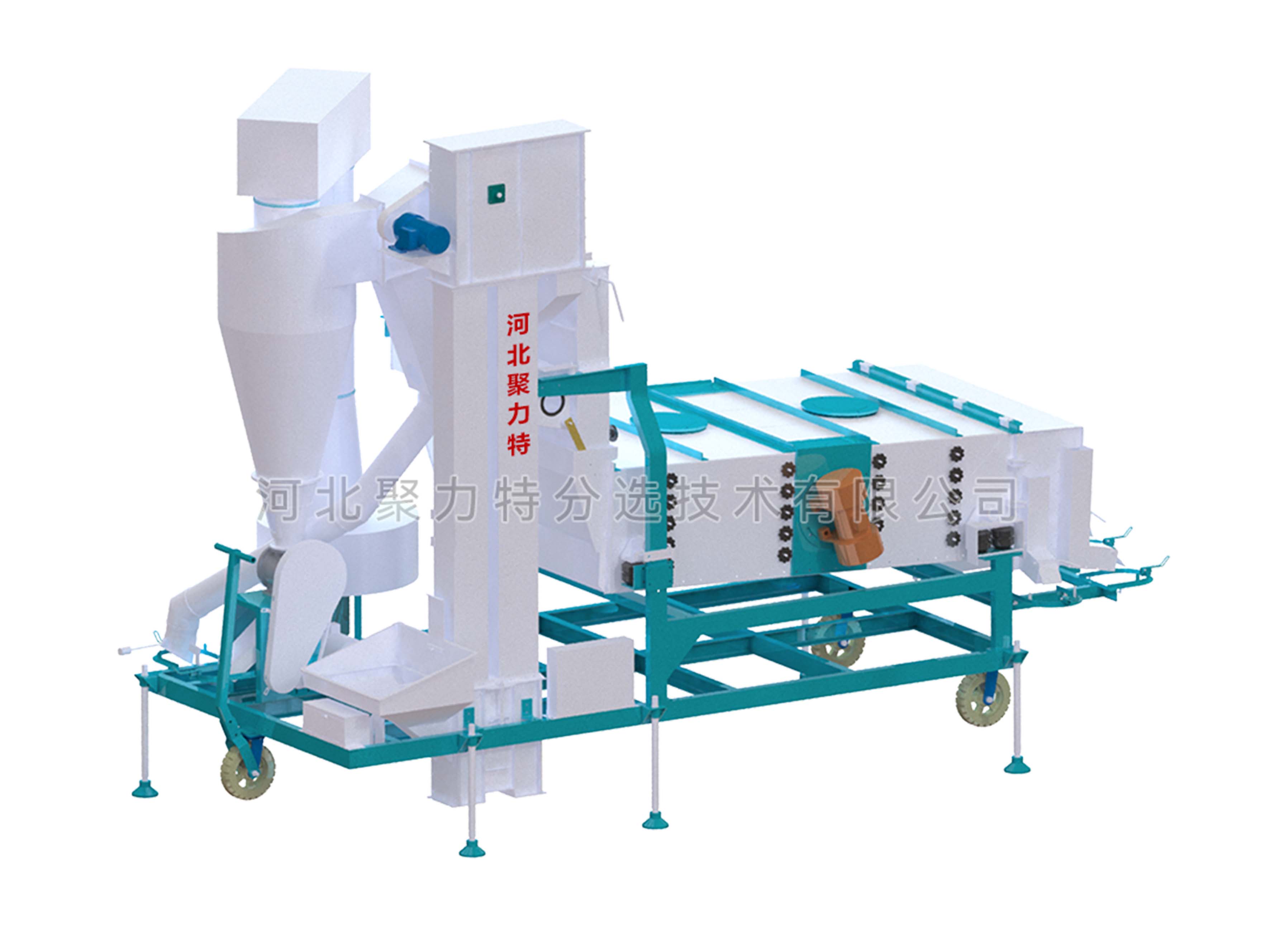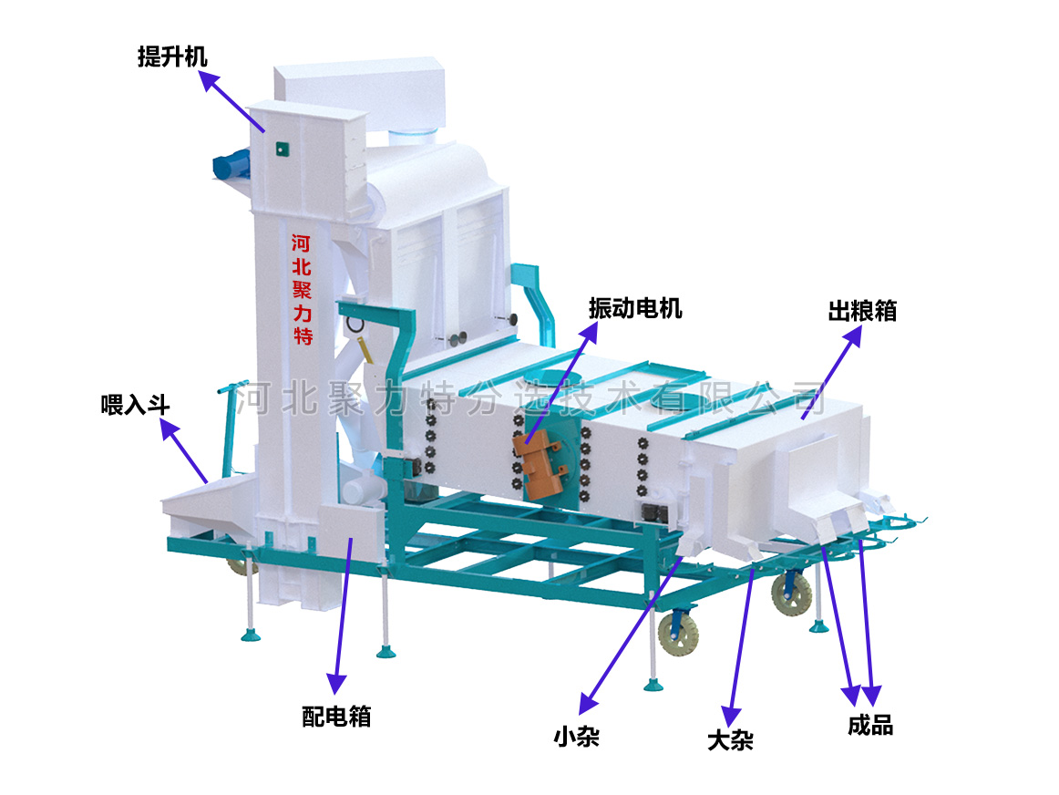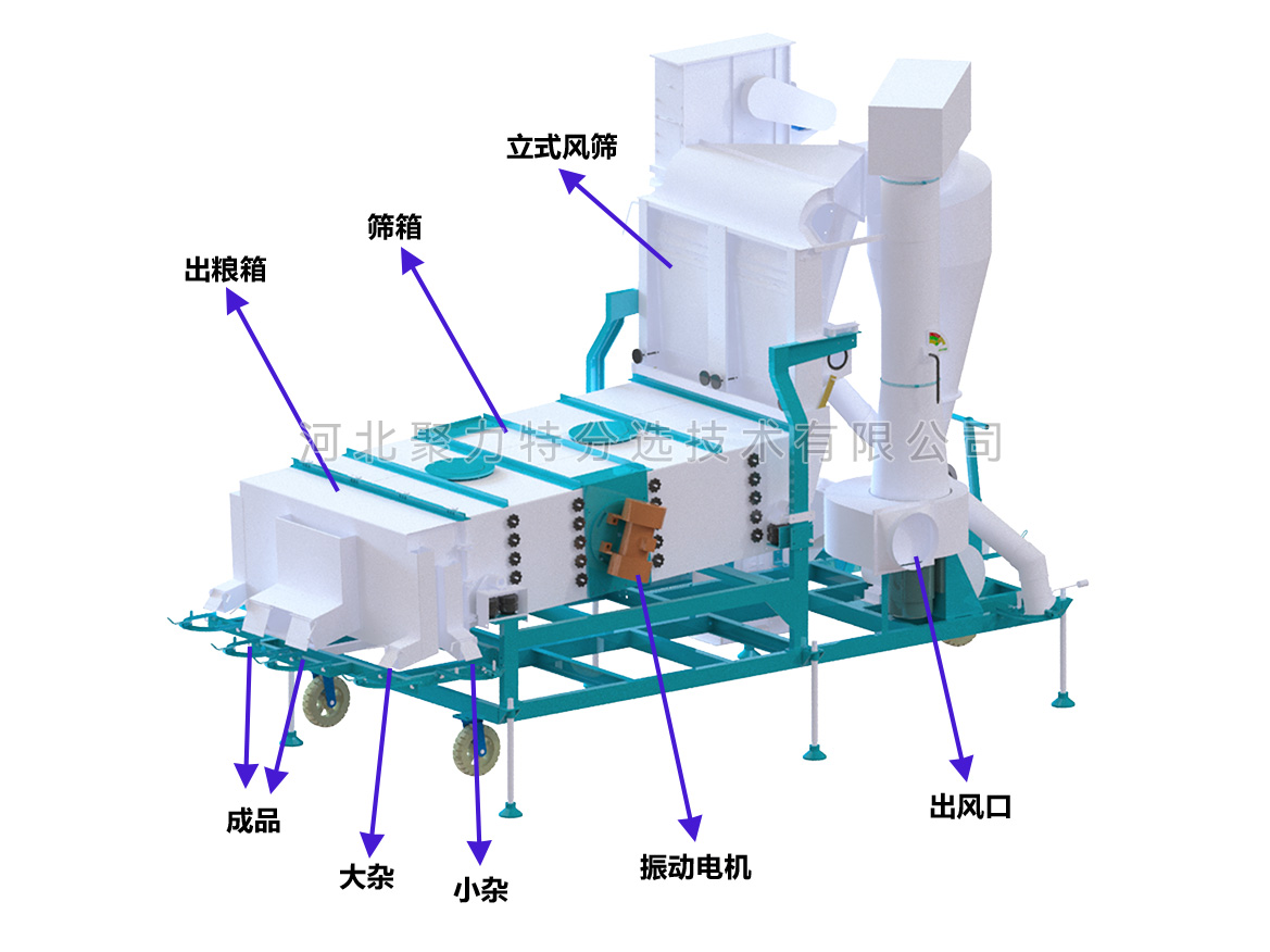 物料通過提升機(jī)進(jìn)入散糧箱,散糧均勻后進(jìn)入立式空氣篩,物料在風(fēng)力的作用下分離出輕雜質(zhì),經(jīng)旋風(fēng)除塵器過濾后,由閉風(fēng)器排出。物料進(jìn)入振動(dòng)篩,根據(jù)物料的外形尺寸來調(diào)整不同規(guī)格的精密沖孔篩片,去除大雜和小雜同時(shí)通過增減篩片的層數(shù)將成品分成大粒和中小粒。